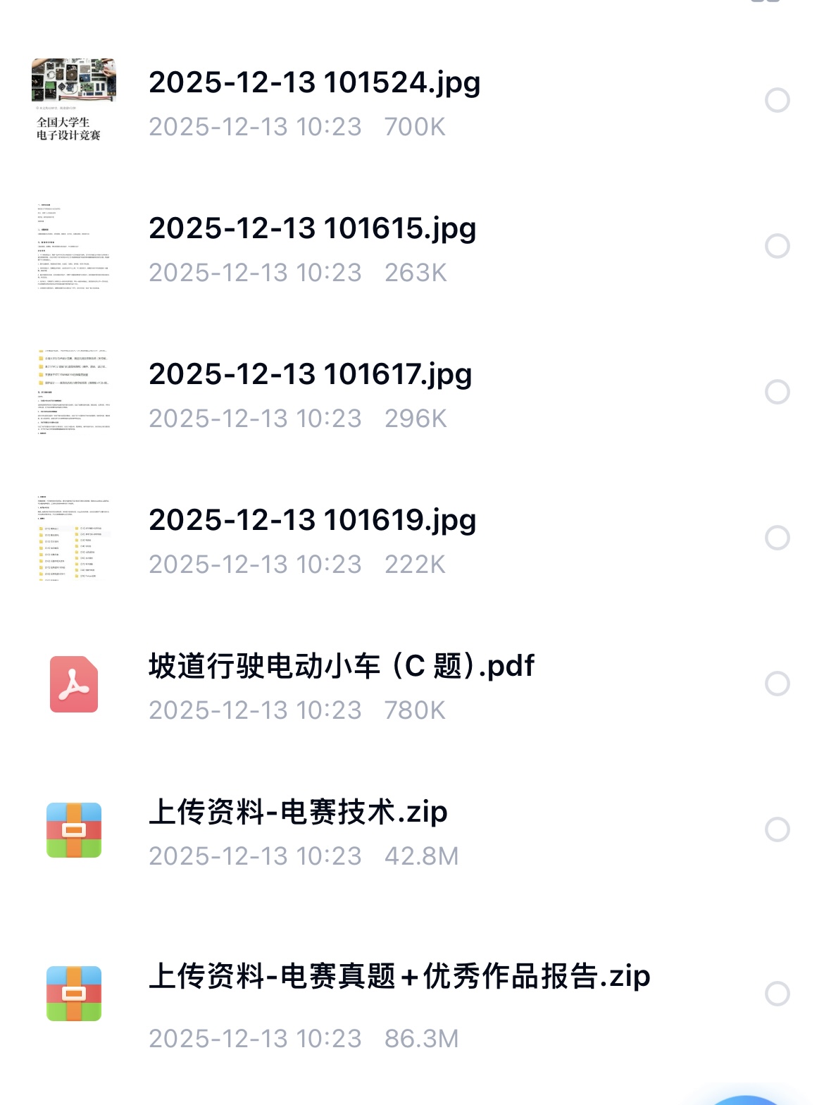 更硬核的是实战资料板块,不仅有「坡道行驶电动小车(C题)」这类经典赛题的详细解析PDF,还有「电赛技术资料包」,里面涵盖了电源、控制、传感器等核心模块的设计技巧,从硬件原理图到软件代码思路都讲得透透的;最珍贵的是「电赛真题+优秀作品报告」压缩包,里面不仅有历年全赛题,还有获奖团队的设计报告,从需求分析到方案选型,再到调试优化,每一步都写得超详细,跟着优秀作品学设计思路,比自己瞎琢磨高效太多。